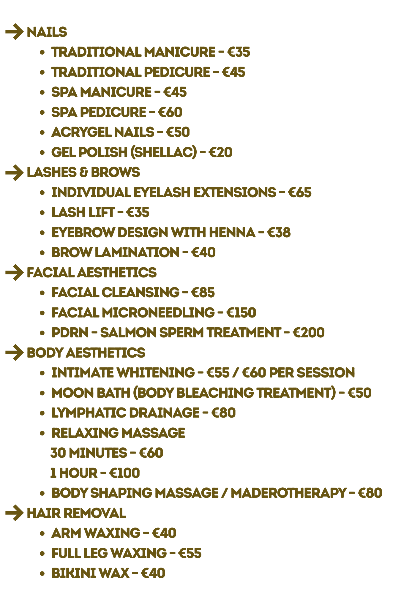 Our professional qualifications include a wide range of services, such as spa manicure, spa pedicure, long-lasting individual care, henna eyebrows, facial cleansing, moonlight body treatment, facial microneedling, intimate whitening, lymphatic drainage, relaxing massage, and maderotherapy.